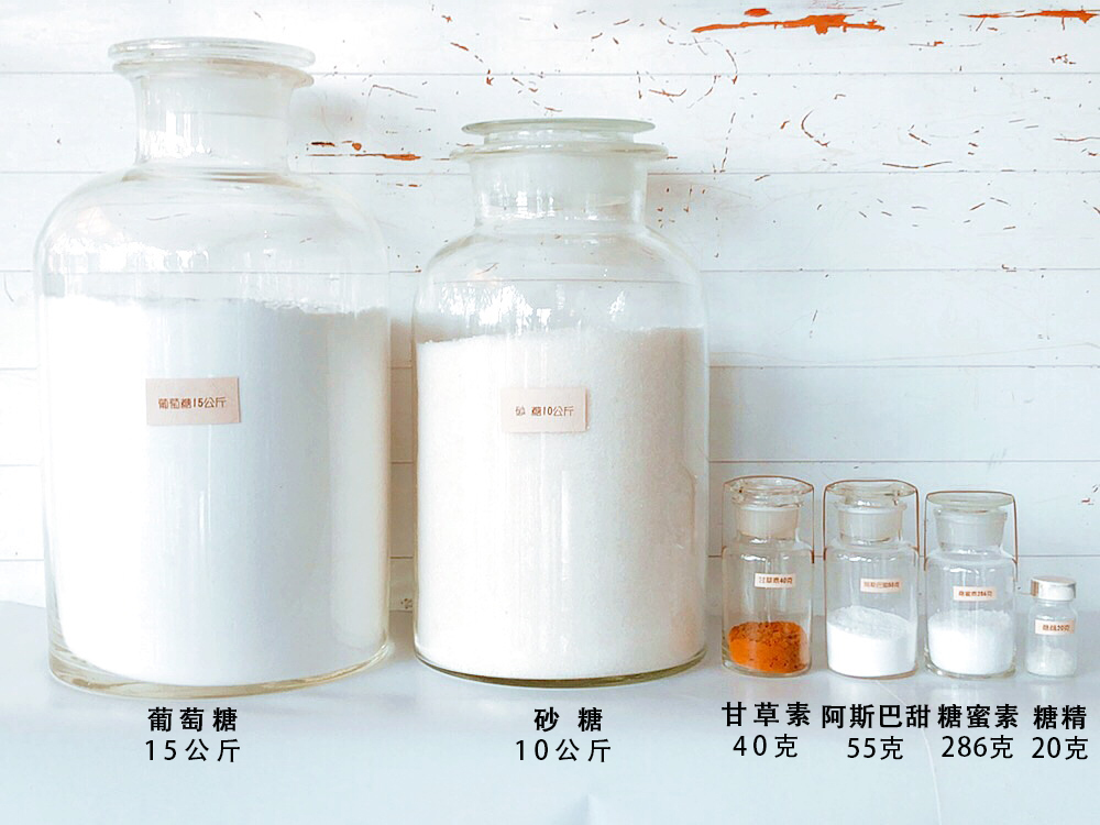 葡萄糖15公斤 = 砂 糖10公斤 =糖蜜素286克= 阿斯巴甜55克 =甘草素40克 = 糖精20克