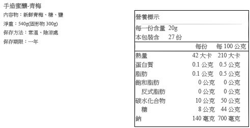 台灣青梅遵阿嬤傳承方法,配合現代化工廠製作。一粒粒小心製作,含有淡淡杏香。稀釋冰飲、調酒醇品,或冷凍當情人果、打冰沙更是許多高手們的絕技。多重享受,實在好味道! ★冷飲:加5倍水稀釋。 ★冷凍:湯汁稀釋1倍再冰。(無防腐劑,開封請儲存於冰箱中。)